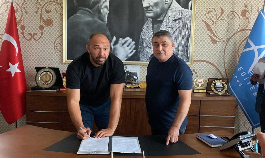 Tarihi Kırkpınar Yağlı Güreşleri'nde 4 kez altın kemer kazanan başpehlivan Ali Gürbüz, Antalya'nın Aksu Belediyesi ile sözleşme imzaladı. Başkanlık makamında düzenlenen törende yeni sezon için Aksu Belediye Başkanı İsa Yıldırım (sağda) ile Ali Gürbüz (solda) sözleşmeye imza attı.