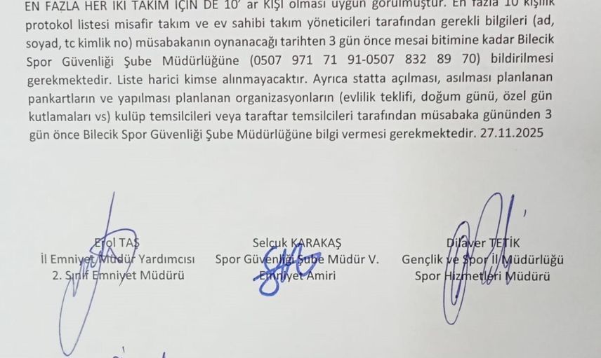 "İlimizde yapılacak olan futbol müsabakalarında 1 Ekim 2025 tarihli İl Spor Güvenlik Kurulu Kararlarında alınan misafir seyirci yasağına istinaden il ve ilçe statlarının fiziki şartları ve alınacak güvenlik tedbirleri nedeni ile protokol sayılarının yapılan değerlendirme neticesinde en fazla her iki takım için de 10’ar Kişi olması uygun görülmüştür. En fazla 10 kişilik protokol listesi misafir takım ve ev sahibi takım yöneticileri tarafından gerekli bilgileri (ad, soyad, tc kimlik no) müsabakanın oynanacağı tarihten 3 gün önce mesai bitimine kadar Bilecik Spor Güvenliği Şube Müdürlüğüne (bildirilmesi gerekmektedir. Liste harici kimse alınmayacaktır. Ayrıca statta açılması, asılması planlanan pankartların ve yapılması planlanan organizasyonların (evlilik teklifi, doğum günü, özel gün kutlamaları vs) kulüp temsilcileri veya taraftar temsilcileri tarafından müsabaka gününden 3 gün önce Bilecik Spor Güvenliği Şube Müdürlüğüne bilgi vermesi gerekmektedir"