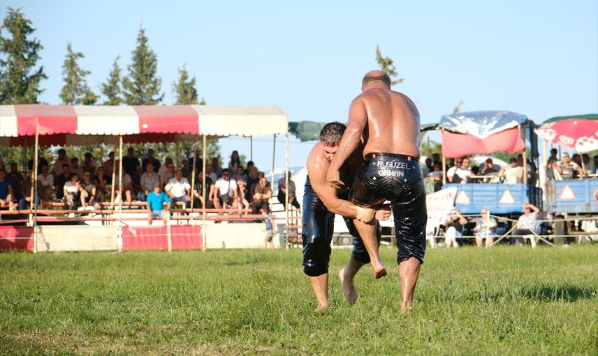 Kırklareli'nde düzenlenen Kavasoğlu ve Şamdancıbaşı İbrahim Yağlı Pehlivan Güreşlerinde Orhan Okulu (solda), başpehlivan oldu.
