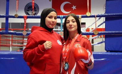 Kayseri'de ağabeyinden etkilenerek 11 yaşında kick boksa başlayan, wushu ve kick boksta 5 Türkiye şampiyonluğu kazanan Ecrin Gülay Düzgün (sağda), madalyalarına yenilerini eklemek için çalışmalarını sürdürüyor.