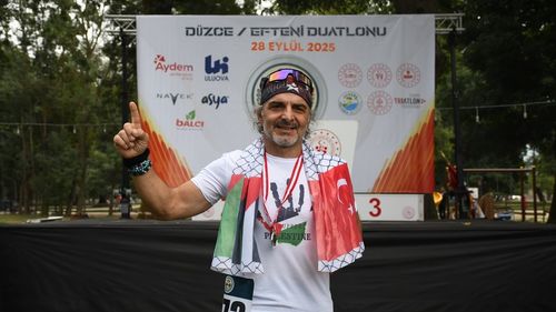 Düzce'de 25 ilden 100'ü aşkın sporcunun katıldığı Efteni Duatlonu yapıldı; yarış sonunda Yaşar Artun Gazze'ye destek amaçlı "Palestine" yazılı tişörtle mesaj verdi.