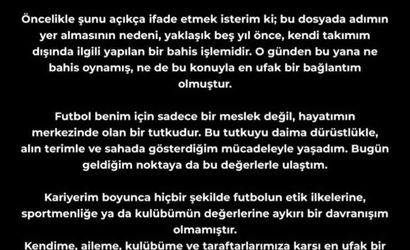'Futbol benim için sadece bir meslek değil, hayatımın merkezinde olan bir tutkudur. Bu tutkuyu daima dürüstlükle, alın terimle ve sahada gösterdiğim mücadeleyle yaşadım. Bugün geldiğim noktaya da bu değerlerle ulaştım. Kariyerim boyunca hiçbir şekilde futbolun etik ilkelerine, sportmenliğe ya da kulübümün değerlerine aykırı bir davranışım olmamıştır. Kendime, aileme, kulübüme ve taraftarlarımıza karşı en ufak bir mahcubiyet yaşamamak için her zaman şeffaf oldum, bundan sonra da aynı duruşu sürdüreceğim.'