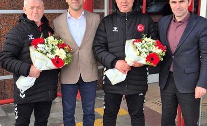 Estonya'da yapılan "Avrupa Pomsae Şampiyonası"nda senyörler kategorisinde madalya kazanan Mustafa Kemal Yıldıran (solda) ile Ömer Budancamanak (sağ 2) memleketleri Erzurum'da çiçeklerle karşılandı.