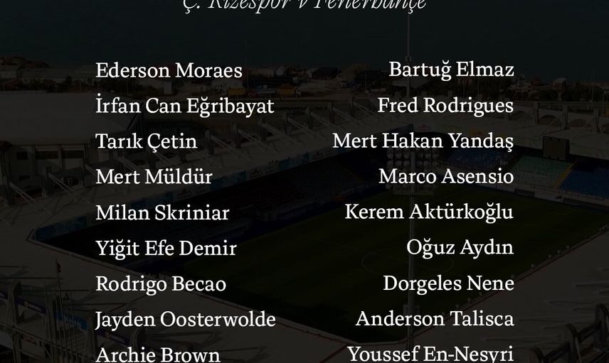 Fenerbahçe’nin 21 kişilik kamp kadrosu: Ederson, İrfan Can Eğribayat, Tarık Çetin, Mert Müldür, Milan Skriniar, Yiğit Efe Demir, Rodrigo Becao, Jayden Oosterwolde, Archie Brown, Levent Mercan, İsmail Yüksek, Bartuğ Elmaz, Fred, Mert Hakan Yandaş, Marco Asensio, Kerem Aktürkoğlu, Oğuz Aydın, Dorgeles Nene, Anderson Talisca, Youssef En-Nesyri, Jhon Duran.