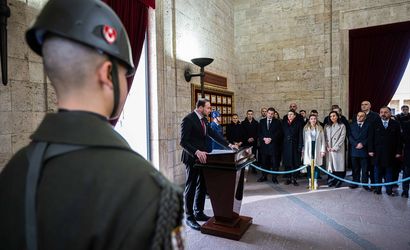 Mesut Çebi başkanlığındaki heyet, Atatürk'ün mozolesine kırmızı beyaz karanfillerle süslenmiş çelenk bıraktıktan sonra saygı duruşunda bulundu. Anıtkabir merdivenlerinde hatıra fotoğrafı çektiren heyet, daha sonra Misak-ı Milli Kulesi'ne geçti.