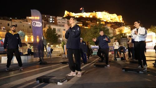 Mardin Cumhuriyet Meydanı'nda açılan 'Spor İçin Geç Değil Projesi' kapsamında vatandaşlar spor yaptı, parkurlarda egzersiz ve sokak yürüyüşü gerçekleştirildi.