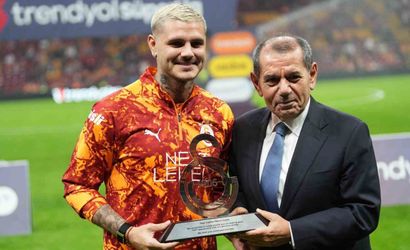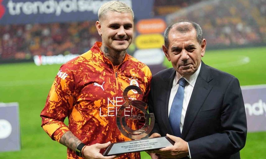 Bu başarıyı anmak üzere Galatasaray Başkanı Dursun Özbek, saha kenarında Icardi’ye bir plaket ve üzerinde 100 yazılı sarı-kırmızılı formayı takdim etti.