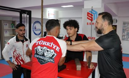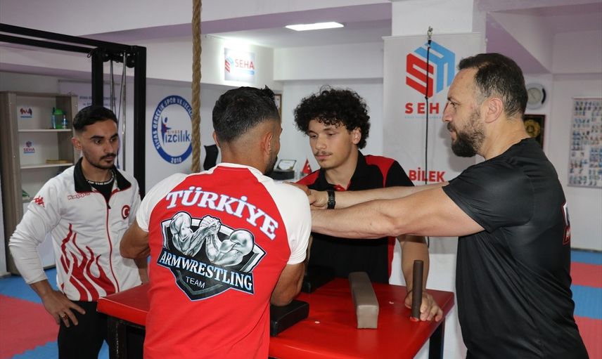 Kayseri'de düzenlenen Türkiye Bilek Güreşi Şampiyonası'nda şampiyonluk başarısı gösteren sporcular, Ebrar Şura Gül, Ceyhan Ağbal, Tuğrulhan Akbaş, Gülçin Savun ve Ömer Korkmaz, Türkiye'yi temsil etmek için antrenman yapıyor.