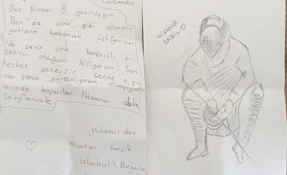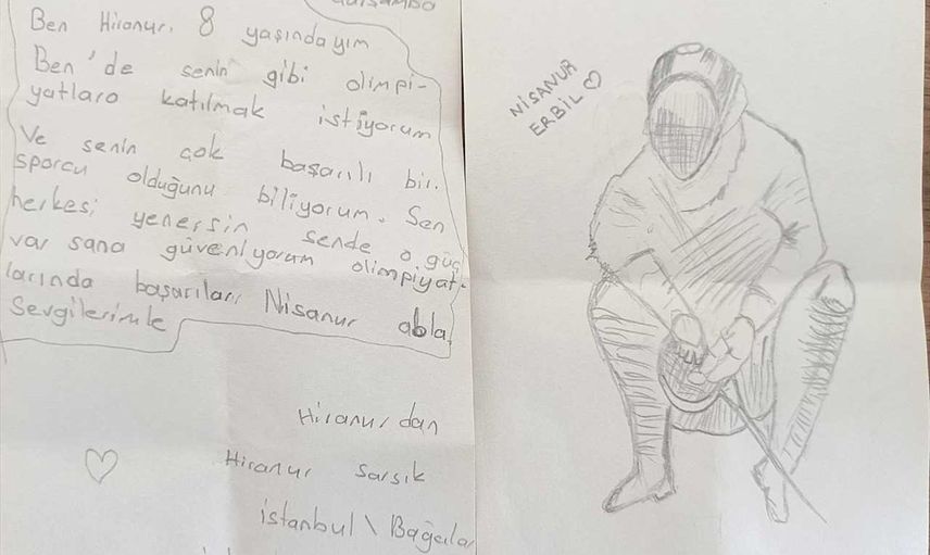 Gençlik ve Spor Bakanlığının İstanbul'daki yaz spor okullarında eğitim alan minik sporcular, Paris 2024 Olimpiyat Oyunları'nda mücadele eden milliler için mektup yazdı. Kılıç branşında Türkiye'yi olimpiyatlarda temsil eden ilk kadın sporcu olan Nisanur Erbil'in resmini çizen Hiranur Sarsık, milli eskrimci gibi olimpiyatlara katılmak istediğini belirtti.