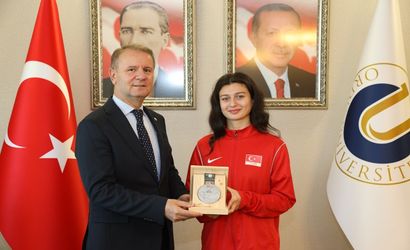 YILMAZ’I MAKAMINDA KABUL EDEREK KENDİSİNİ TEBRİK EDEN REKTÖR PROF. DR. ORHAN BAŞ "ÜNİVERSİTEMİZ ÖĞRENCİSİ VE MİLLİ SPORCUMUZ İLKİM ZEHRA YILMAZ’IN 25’İNCİ DEAFLYMPİCS YAZ OYUNLARI’NDA ELDE ETTİĞİ DÜNYA İKİNCİLİĞİ BİZLER İÇİN BÜYÜK BİR GURUR KAYNAĞI OLMUŞTUR" DEDİ.