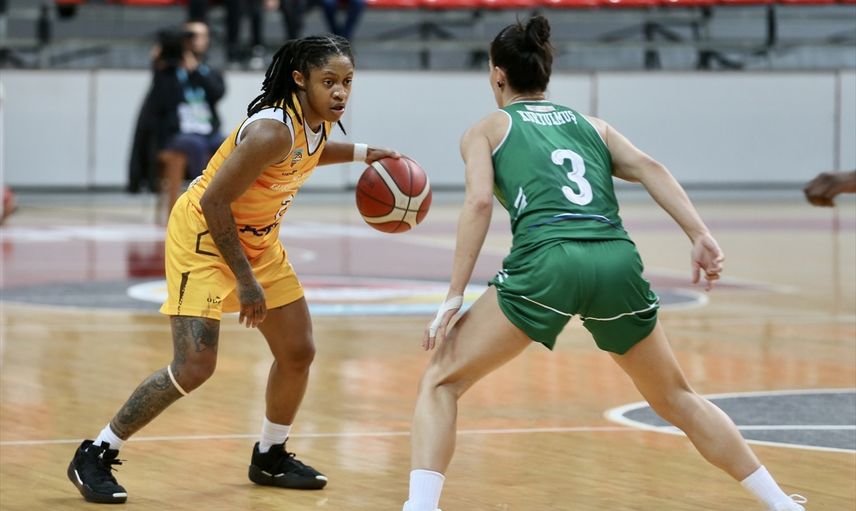 ING Kadınlar Basketbol Süper Ligi'nin 19. haftasında Melikgazi Kayseri Basketbol ile OGM Ormanspor Kadir Has Spor Salonu'nda karşılaştı. Bir pozisyonda Melikgazi Kayseri Basketbol oyuncusu Crystal Simone Dangerfield (solda) rakibiyle mücadele etti.