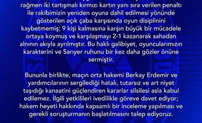 Açıklamada ayrıca, maçın orta hakemi Berkay Erdemir ve yardımcılarının kararlarının hatalı, tutarsız ve art niyet taşıdığı kanaatinin güçlendiği ifade edilerek bu durumun asla kabul edilemez olduğu belirtildi.