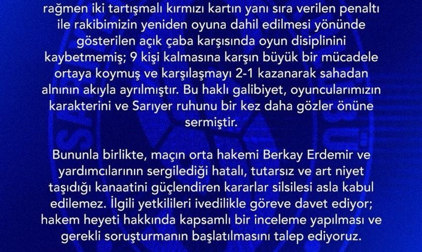 Sarıyer Kulübü, sosyal medya hesabından yayımladığı açıklamada maçta yaşanan yönetim hatalarının camiada büyük üzüntü ve şaşkınlık yarattığını belirtti. Açıklamada, karşılaşmada uygulanan taraflı yönetim ve hakem kararlarındaki ciddi tutarsızlıklara dikkat çekildi.