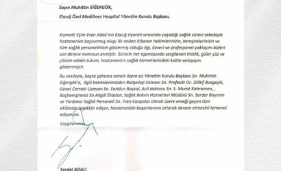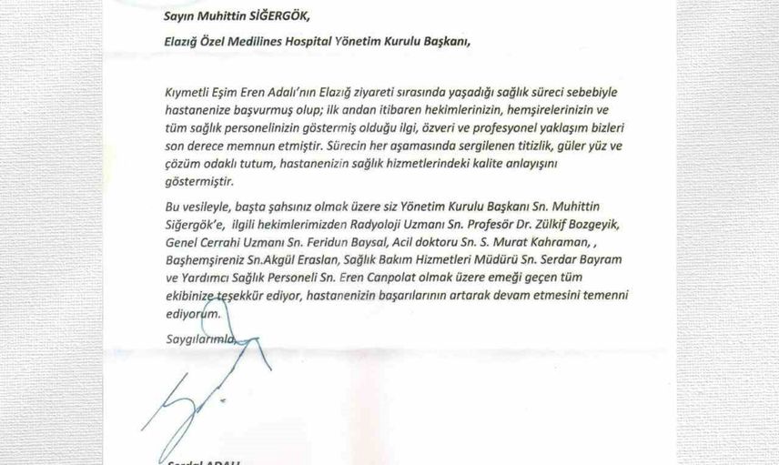 Elazığ Medilines Hospital ise Adalı'nın nazik teşekkürlerine karşılık vererek, başkanın mesajının kendileri için önemli bir motivasyon kaynağı olduğunu duyurdu.
