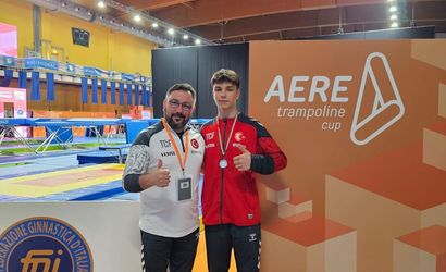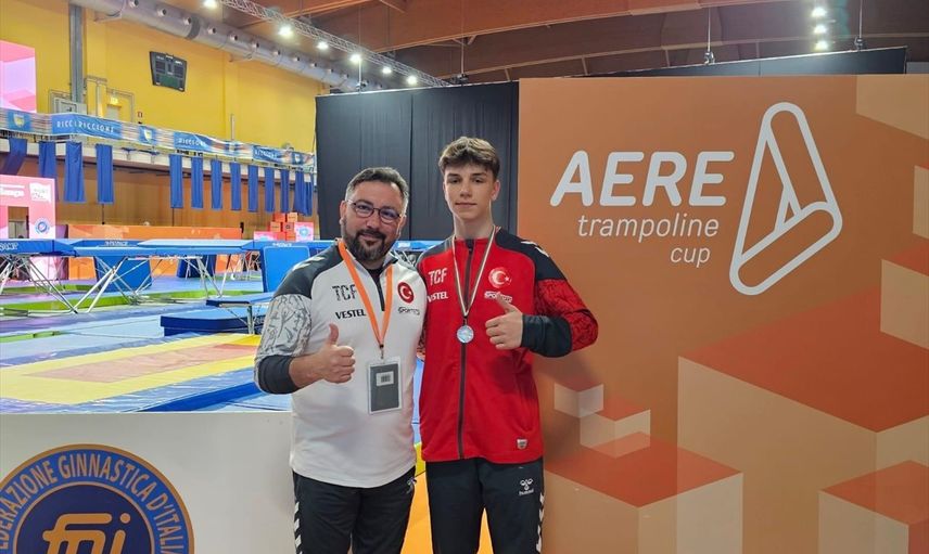 İtalya'da düzenlenen 4. AERE Cup Cimnastik Turnuvası'nda mücadele eden Trampolin Gençler Milli Takım sporcusu Sinan Cankurt (sağda), kürsüde yer aldı.
