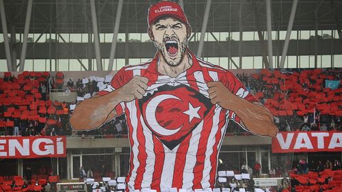 Özbelsan Sivasspor taraftarları, Trendyol 1. Lig 22. haftasında Amed karşılaşması öncesi Sivas 4 Eylül Stadyumu'nda 'Bayrağın rengi, vatanın canıyız' yazılı Türk bayrağı koreografisi gerçekleştirdi.