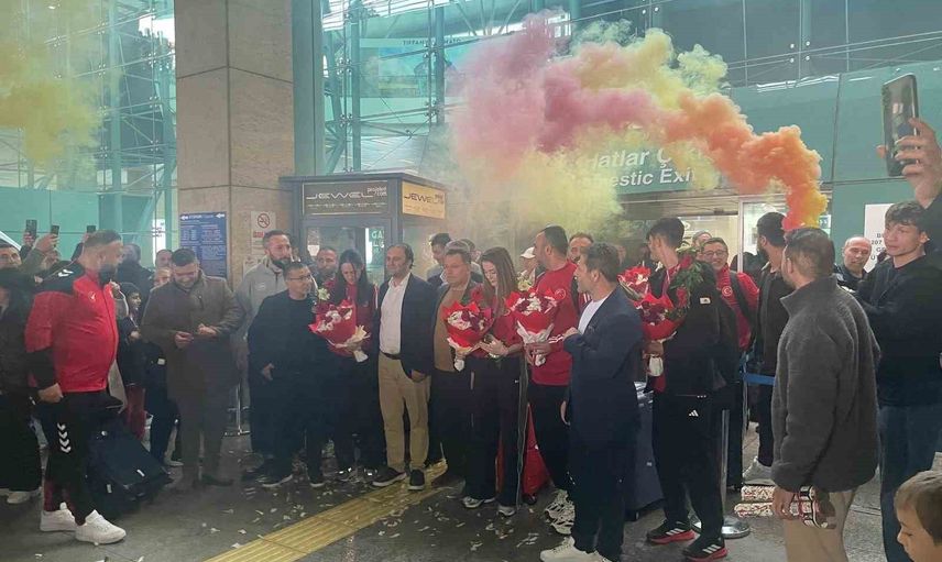 Esenboğa Havalimanı’nda Mehter Marşı grubu ve çiçeklerle karşılanan ay-yıldızlılar, basın mensuplarına açıklamalarda bulundu. Dünya şampiyonları arasında yer alan ASKİ Spor Kulübü sporcuları Merve Dinçel Kavurat, Emine Göğebakan ve Furkan Ubeyde Çamoğlu, Türkiye’yi 2028 Yaz Olimpiyatlarında en iyi şekilde temsil edeceklerini belirtti.