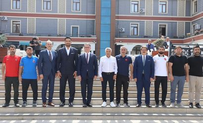 Türkiye Güreş Federasyonu Başkanı Taha Akgül (solda), Doğu ve Güneydoğu Anadolu Bölgesi ziyaretleri kapsamında Van Valisi Ozan Balcı (sağda) ile bir araya geldi.