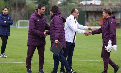 Trabzonspor'un teknik heyet ve oyuncuları, UEFA Gençlik Ligi çeyrek finalinde Inter'i 1-0 yenerek yarı finale yükselen 19 yaş altı bordo-mavili takımın antrenmanını ziyaret etti. Ziyarette teknik direktör Fatih Tekke (ortada) yer aldı.