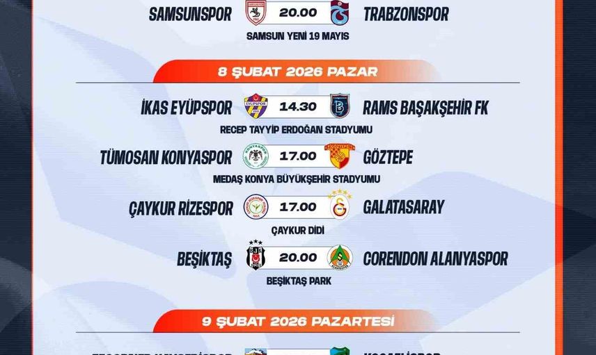 TRENDYOL SÜPER LİG'DE 20. 21 VE 22. HAFTALARDA OYNANACAK MÜSABAKALARIN PROGRAMI AÇIKLANDI.