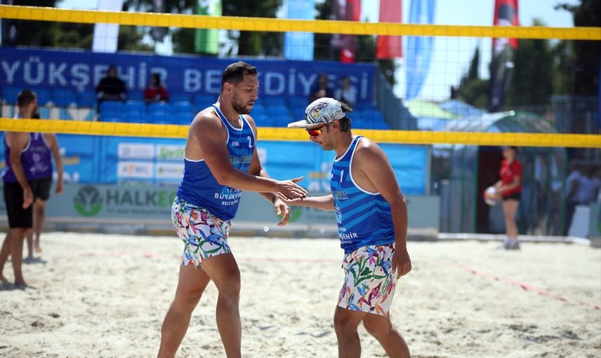 Aydın'ın Efeler ilçesinde Uluslararası Plaj Voleybolu Türkiye Serisi Aydın etabı başladı. Türkiye Voleybol Federasyonu ve Aydın Büyükşehir Belediyesinin iş birliğindeki organizasyonda, erkeklerde Atalay Erdinç Yıldız (solda) ve Oğuz Küçükerol (sağda) aldıkları sayı sonrası sevinç yaşadı.