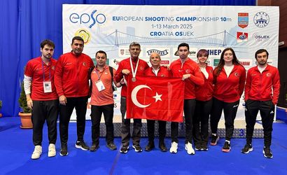 Hırvatistan'da düzenlenen Avrupa Havalı Silahlar Şampiyonası'nda milli atıcı Yusuf Dikeç (solda), erkekler 10 metre havalı tabanca solo kategorisinde gümüş madalya aldı.