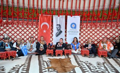 Bu yıl 4'üncü düzenlenecek "Uluslararası Antalya Yörük Türkmen Festivali" 30 Mayıs-1 Haziran'da yapılacak. Büyükşehir Belediye Başkanı Muhittin Böcek(sağda), Döşemealtı Düzlerçamı mevkisindeki Karaman Piknik Alanında kurulan çadırda basın toplantısı düzenledi, ayran ikram etti.