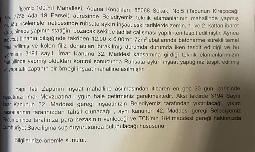 Çukurova Belediyesi teknik ekiplerinin yaptığı yerinde inceleme sonrası hazırlanan 3 Mart 2025 tarihli raporda, tadilatın yapının statiğini bozacak nitelikte olduğu; mevcut binanın bitişiğinde yaklaşık 12x6 metre ebatlarında betonarme temel atıldığı ve kolon filizlerinin bırakıldığı tespit edildi. Raporda işlemlerin 3194 sayılı İmar Kanunu'nun 32. maddesi kapsamında ruhsata aykırı olduğu belirtilerek yapı tatil zaptı düzenlendi ve inşaat mühürlendi.