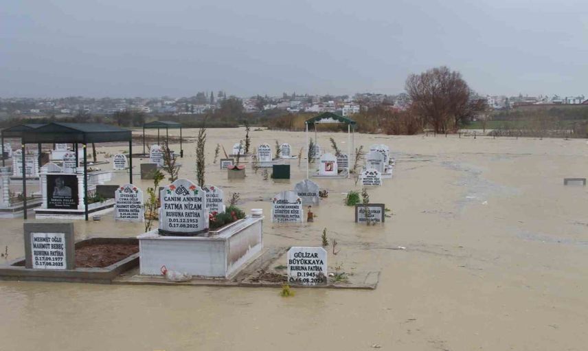 Adana'da sağanak yağış sonrası mezarlık yakınındaki kanalın taşması sonucu onlarca mezar sular altında kaldı.