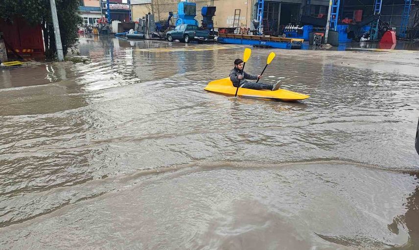 Adana'da sokaklar göle döndü, çalışan imalathanede ürettiği kanoyla sokağa çıktı