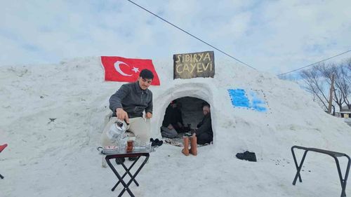 Bitlis'in Adilcevaz ilçesinde bir esnaf, günlerdir yağan karı kürekle şekillendirerek 'kardan çay evi' yaptı; vatandaşlar fotoğraf çektirdi, çalışma moral verdi.