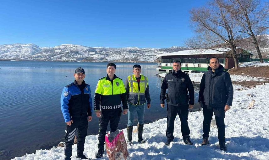 Polis ekipleri, hayvanların soğuk havada karnını doyurabilmesi için çeşitli noktalara yem ve mama bıraktı.