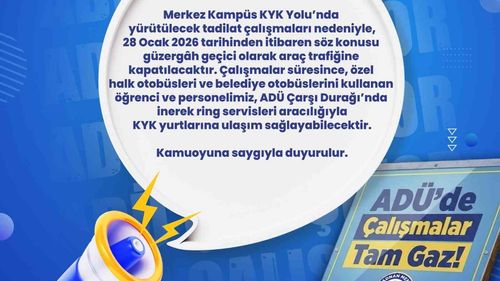 ADÜ, Merkez Kampüs KYK Yolu'nu 28 Ocak 2026'den itibaren tadilat nedeniyle geçici olarak araç trafiğine kapatıyor; ring servisleri ADÜ Çarşı Durağı'ndan hizmet verecek.