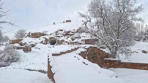 Bitlis'in Ahlat ilçesinde karla kaplanan Selçuklu Meydan Mezarlığı, kümbetler, Bayındır Köprüsü ve mağara evleri kartpostallık görüntüler sundu.