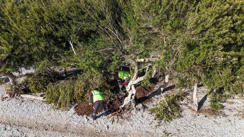 Menteşe Belediyesi ekipleri, Akbük Plajı’nda devrilen sakız ağacını kök ve gövdeye zarar vermeden insan gücüyle yerine dikti.