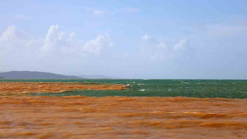 Muğla'nın Akyaka Mahallesi'nde sağanak yağış ve fırtına sonucu dağlardan gelen çamurlu sular denize karıştı, Akyaka ve Gökçe Sahili'nde deniz kahverengiye döndü.