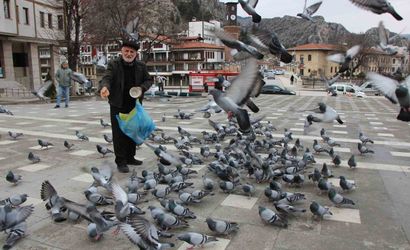 84 yaşındaki Cahit Kalaycı, Amasya sokaklarındaki güvercinleri 20 yıldır emekli maaşından ayırdığı parayla aldığı yemler ve topladığı bayat ekmeklerle besliyor. Kuşların aç kalmaması için her gün kahvaltıdan önce şehri dolaşan Kalaycı, elindeki çanta ve poşetlerle hızlı adımlarla farklı noktalarda kuşların yanına gidiyor.