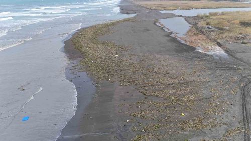 Hatay'daki kuvvetli yağışla Asi Nehri'ndeki istilacı su sümbülleri Akdeniz'e sürüklendi; dalgalar su sümbüllerini Samandağ sahiline taşıdı ve kıyı yeşile büründü.