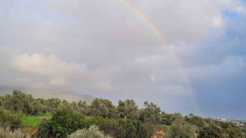 Aydın'ın Efeler ilçesinde sağanak sonrası Tralleis Antik Kenti üzerinden yükselen gök kuşağı, kent merkezine uzanarak kartpostallık görüntüler oluşturdu.