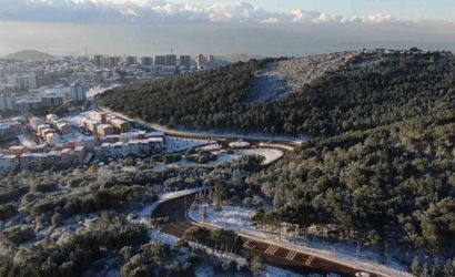 Aydos Ormanı ve çevresindeki ağaçlar ile yollar, sabahın ilk ışıklarıyla birlikte beyaza büründü. Havadan kaydedilen görüntülerde tüm alanın karla kaplandığı net biçimde görüldü.