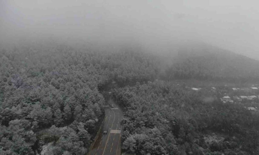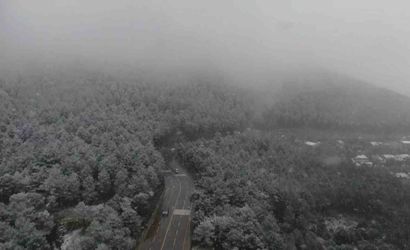 Kar yağışıyla birlikte bölge kısa sürede beyaz örtüyle kaplanırken, ağaçlar ve yollar karla örtüldü. Oluşan manzara, dronla havadan kaydedildi.