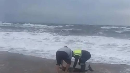 Sarımsaklı Plajı'nda karaya vuran yunus, vatandaşlar ve Ayvalık Belediyesi görevlisinin müdahalesiyle yeniden denize gönderildi.