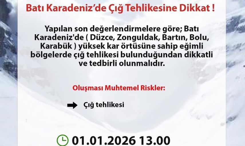 "Yapılan son değerlendirmelere göre Batı Karadeniz’de Düzce, Zonguldak, Bartın, Bolu ve Karabük illerinde yüksek kar örtüsüne sahip eğimli bölgelerde çığ tehlikesi bulunduğundan dikkatli ve tedbirli olunmalıdır"