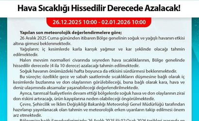 Meteoroloji Genel Müdürlüğü, 26 Aralık 2025 ile 2 Ocak 2026 tarihleri arasında bölgeye bağlı il merkezlerinde en düşük hava sıcaklıklarının eksi değerlere kadar düşebileceğini belirterek, yayımlanacak tahmin ve meteorolojik erken uyarıların yakından takip edilmesinin önem taşıdığını vurguladı.