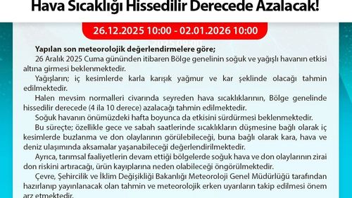 Meteoroloji Genel Müdürlüğü, Batı Karadeniz için 6–8 kuvvetinde fırtına ve 26 Aralık 2025'ten itibaren soğuk, yağışlı hava; sıcaklıklar 4–10°C düşecek, kar ve buzlanma riski var.