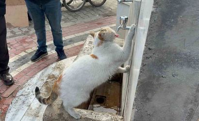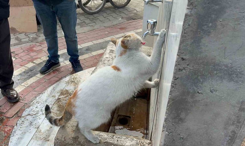 Susuzluktan bitkin düştüğü gözlenen kedi, duyarlı vatandaşların musluğu açmasıyla rahatladı. Bir patisiyle musluğu kavrayan kedi, dakikalarca kana kana su içti.