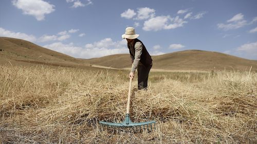 Bayburt'un Beşpınar köyünde, Kenan Yavuz Etnografya Müzesi tarafından düzenlenen etkinlikte asırlık tarım aletleriyle buğday hasadı yapıldı.