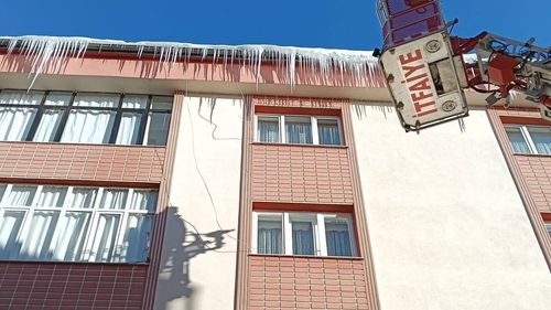 Bayburt Belediyesi ekipleri, vatandaş güvenliği için bina saçaklarındaki buz sarkıtlarını temizliyor; ara sokak, kaldırımlar ve dolmuş duraklarında buz kırma ve tuzlama çalışması yapılıyor.