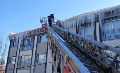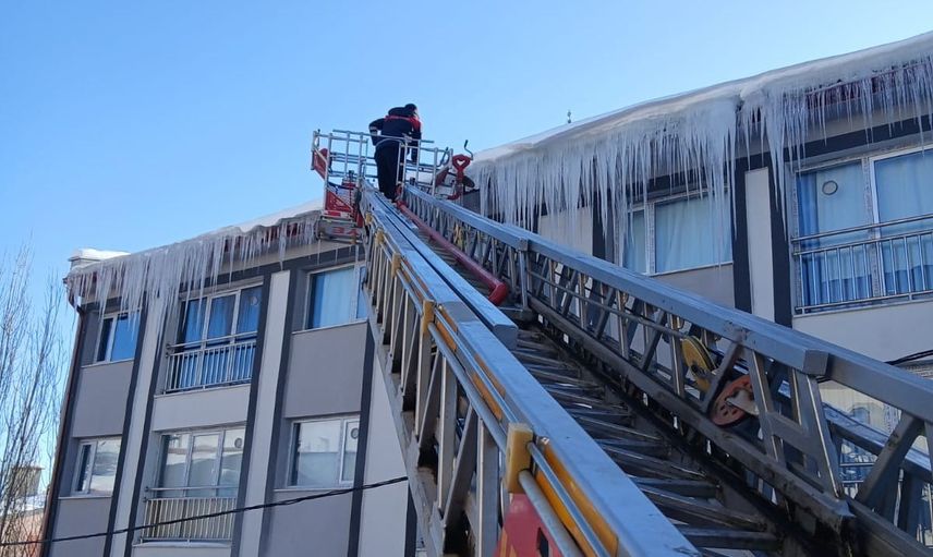 İtfaiye ekipleri, risk oluşturan bölgelerde çalışma başlattı. İtfaiye aracı merdiveni yardımıyla çatı saçaklarında oluşan buz sarkıtları kontrollü şekilde düşürülüyor.