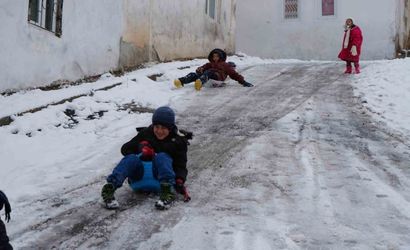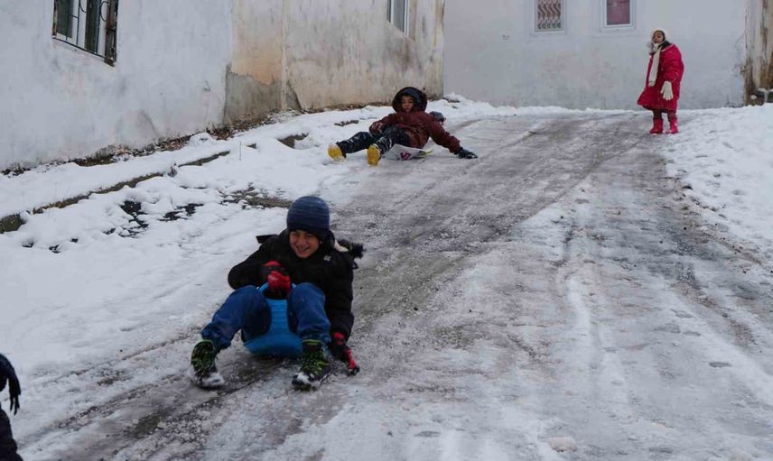 Bayburt'un köklü mahallelerinden Şingah Mahallesinde yağan karı fırsat bilen çocuklar, mahalledeki dik yokuşu kayak pistine çevirdi. Poşet ve plastik kayak tahtalarıyla kayan çocuklar, soğuk havaya aldırış etmeden gönüllerince eğlendi.